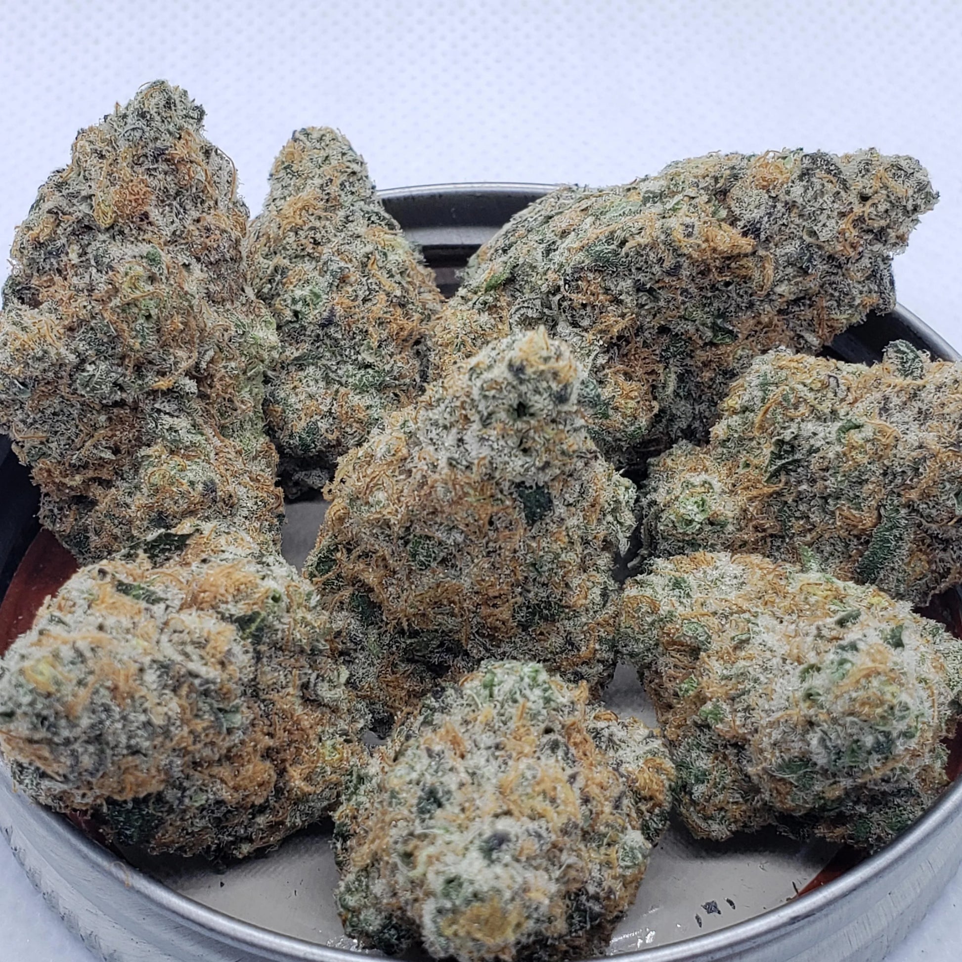 Sweet banana and tropical fruit aroma with subtle herbal, buttery, and citrus undertones. The flavor is creamy and fruity with a touch of floral lavender and nutty notes. Buds are dense, forest green with blue-green highlights, thin orange pistils, and a frosty coating of blue-tinted trichomes.